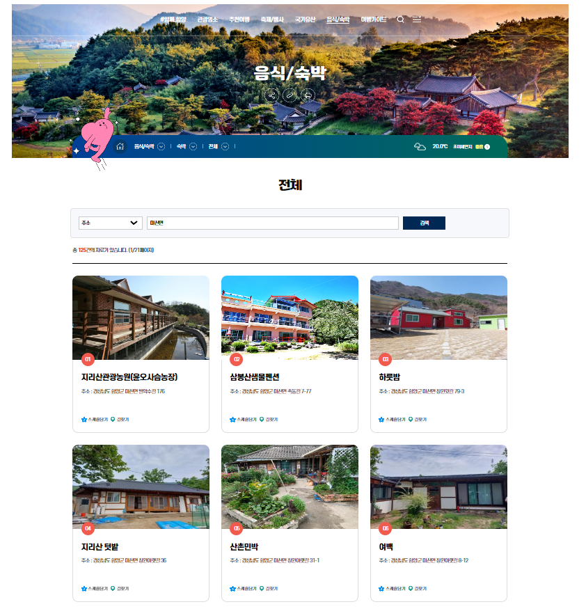 ✅ 함양군 문화관광 포털 (https://www.hygn.go.kr/01579/01580/01587.web)에서 원하는 위치에 있는 숙소를 찾아볼 수 있습니다. 촬영지와 가까운 '마천면'으로 검색했을때 120곳이 넘게 나오니 원하는 위치의 숙소 구하기 어렵지 않을 듯 하네요. 더불어 부킹닷컴, 야놀자 등의 숙박 사이트나 에어비앤비를 통해서도 숙소를 찾아볼 수 있습니다.