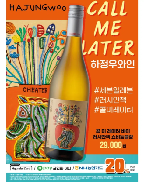 세븐일레븐은 하정우와 협업하여 그의 그림이 라벨로 사용된 와인을 8월 17일 출시했습니다. 해당 와인의 이름은 "콜미 레이터(call me later)"! 해당 와인은 '러시안 잭' 소비뇽 블랑 제품 ('러시안 잭' 와인에 하정우 그림을 라벨링한 제품)으로 세계적으로 유명한 뉴질랜드의 와이너리 그룹 '마틴보로 빈야드'에서 제조, 엄격한 SWNZ(지속 가능 와인 재배 뉴질랜드) 인증을 받았다고 합니다.