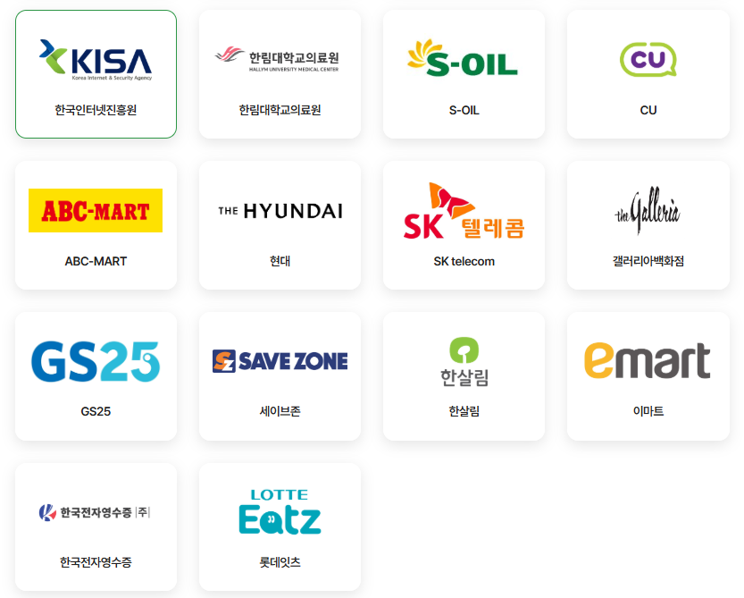 - 총 30개 기업으로 이마트, 홈플러스와 같은 마트 & 현대백화점, 신세계백화점 같은 백화점 & CU, GS25같은 편의점 & 하나은행, 국민은행같은 은행이 대표적